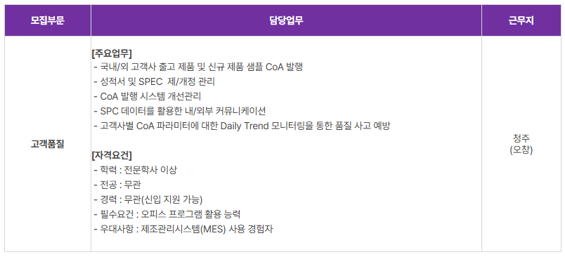 이번 채용 공고를 통해 반도체 소재 분야 품질보증 직무 신입/경력 인재를 모집합니다.